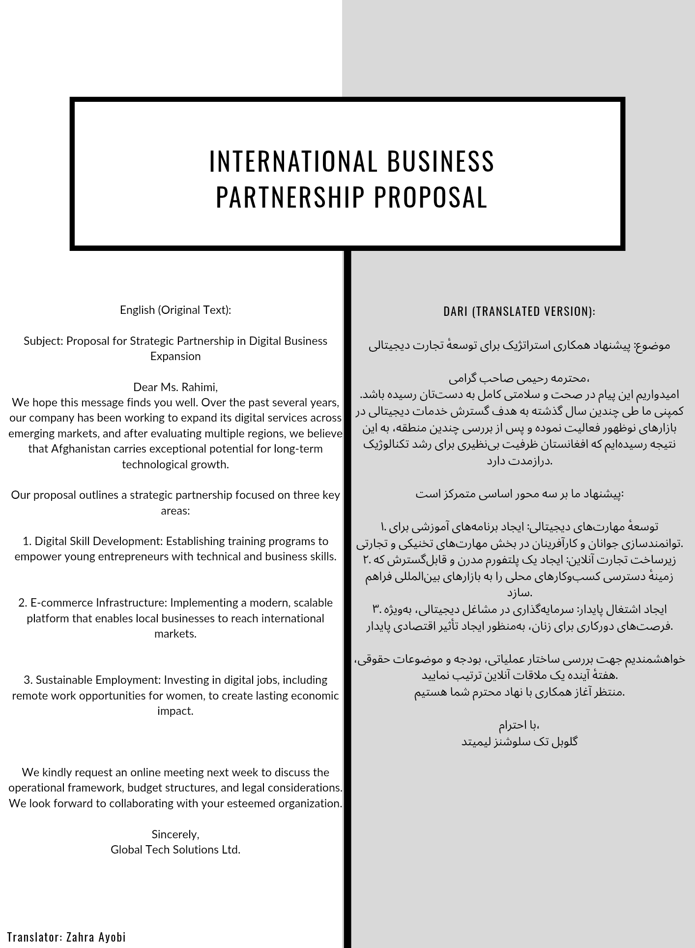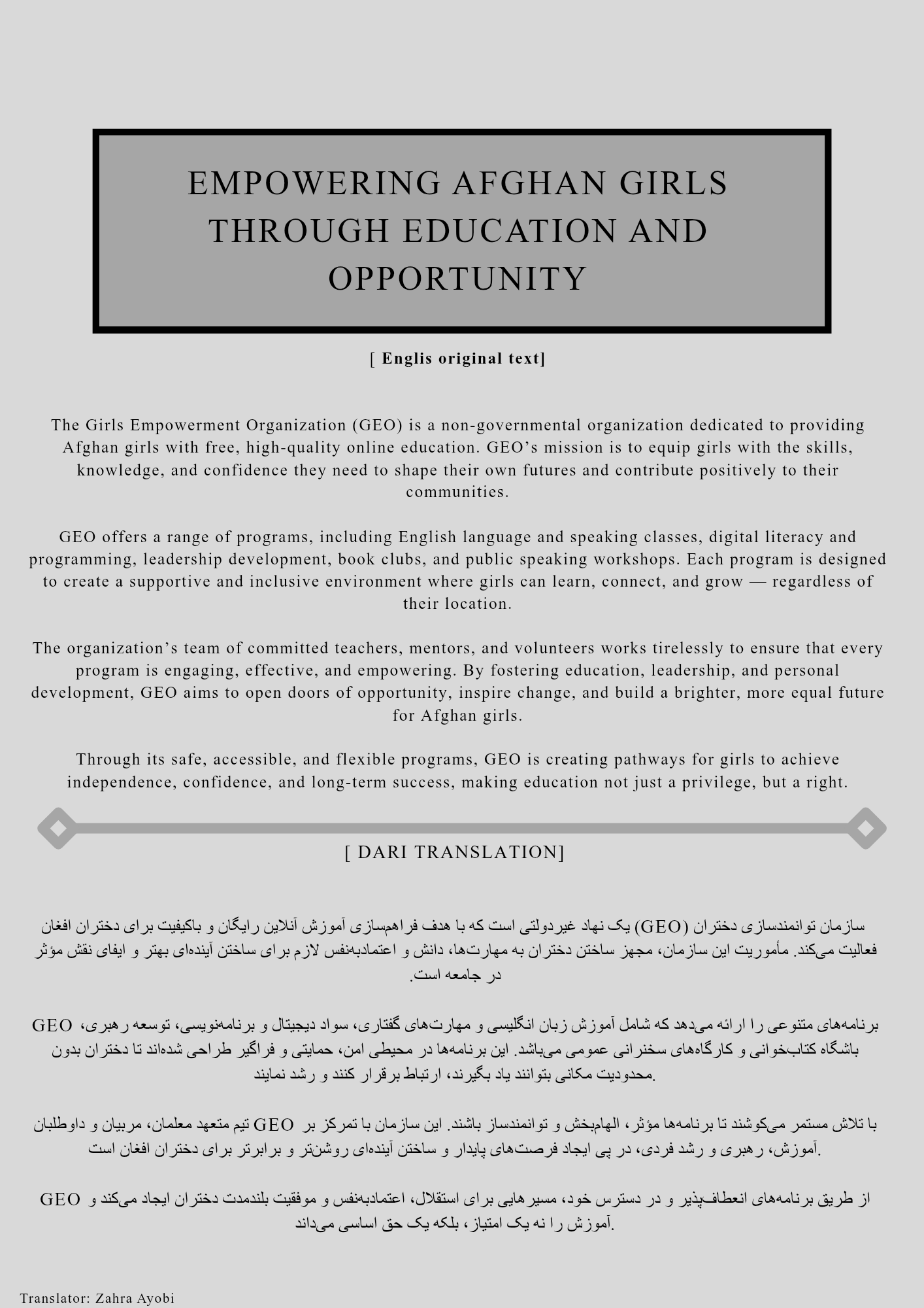 Zahra Ayobi is a professional translator and educator proficient in English and Dari. With a background in academic writing and international debates, she possesses strong communication and digital skills. Currently working as an online educator, she specializes in teaching school subjects and preparing professional documents. Zahra seeks remote opportunities due to restrictions on women’s work in Afghanistan.